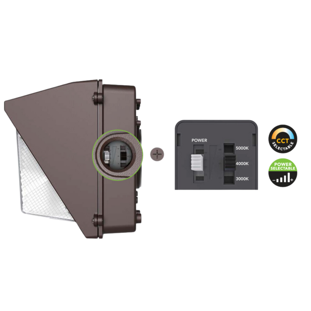 Our premium LED Wall Pack 135W – CCT Adjustable & Wattage Selectable is a perfect solution to enhance the exterior aesthetic of your building. With its timeless design, it seamlessly conceals any previous wall pack stains. The 3CCT option grants you the flexibility to choose from 3000K, 4000K, and 5000K color temperatures, while the wattage selectable feature enables wattage customization at 100%, 80%, 60%, and 40%.