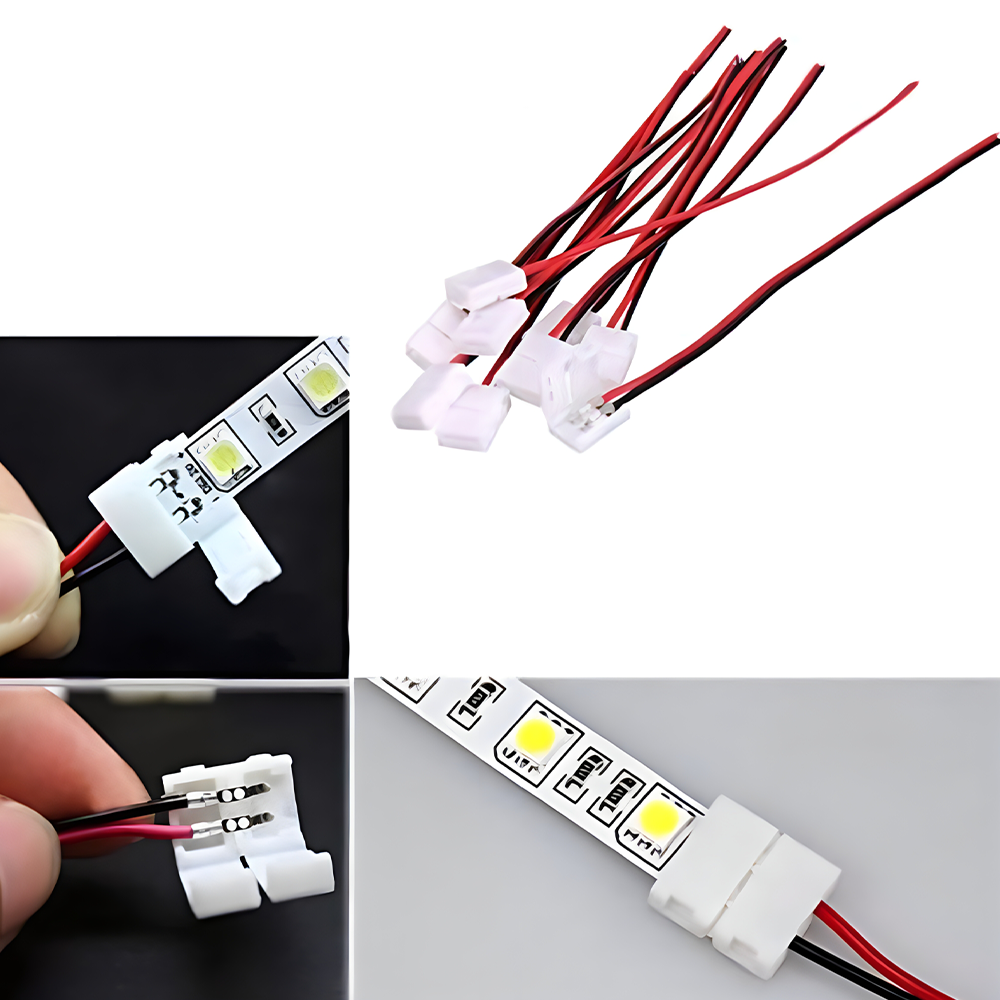 The Single Color Bare Connector – Indoor is a reliable, easy-to-install solution for connecting 10mm single-color LED strip lights in residential and commercial indoor settings. Featuring a 2-pin 22 AWG copper wire with a durable PVC jacket, this connector supports a wide input voltage range (5V–48V) and handles up to 4A of current. Its compact, flexible design ensures stable connections for custom LED strip lighting setups. Ideal for under-cabinet lights, accent lighting, and DIY LED projects.
